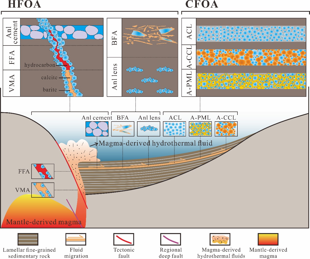同类型方沸石与不同性质的流体及其运移阶段相关。热液流体来源方沸石在岩浆热液流体上升过程中形成。岩浆热液流体进入湖水并与湖水混合后,晶体颗粒之间的热斥力使其移动形成细粒沉积层,孔隙中的原生流体直接沉淀或通过改造粘土矿物和长石形成原生流体来源方沸石(图2)。总体来讲,研究区方沸石的形成主要受兰聊断层活化作用影响下高频率、低强度的岩浆活动驱动。