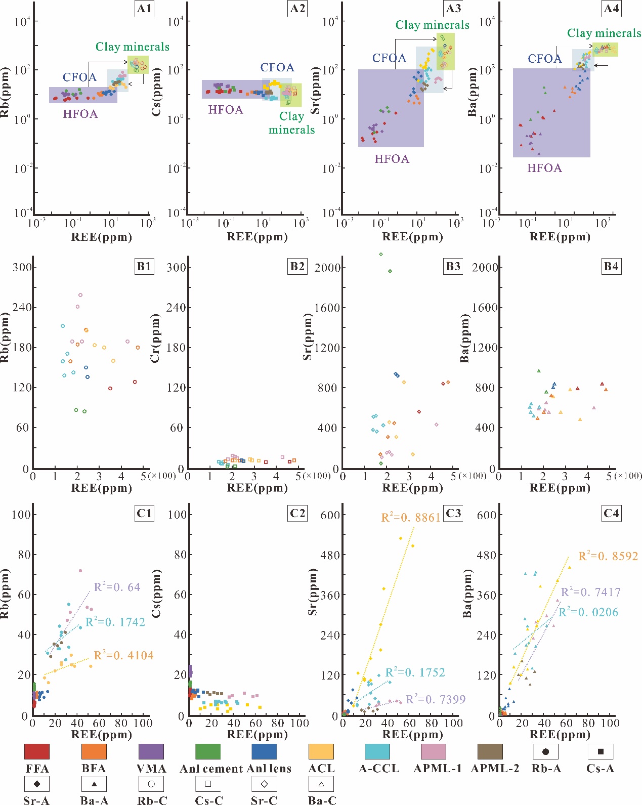 图1.方沸石/黏土矿物 稀土元素及大离子亲石元素相对富集模式