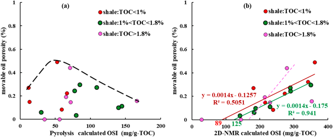 图2.可动油孔隙度与热解S1计算的OSI (a)和2D-NMR测量的游离油(b)的相关性图