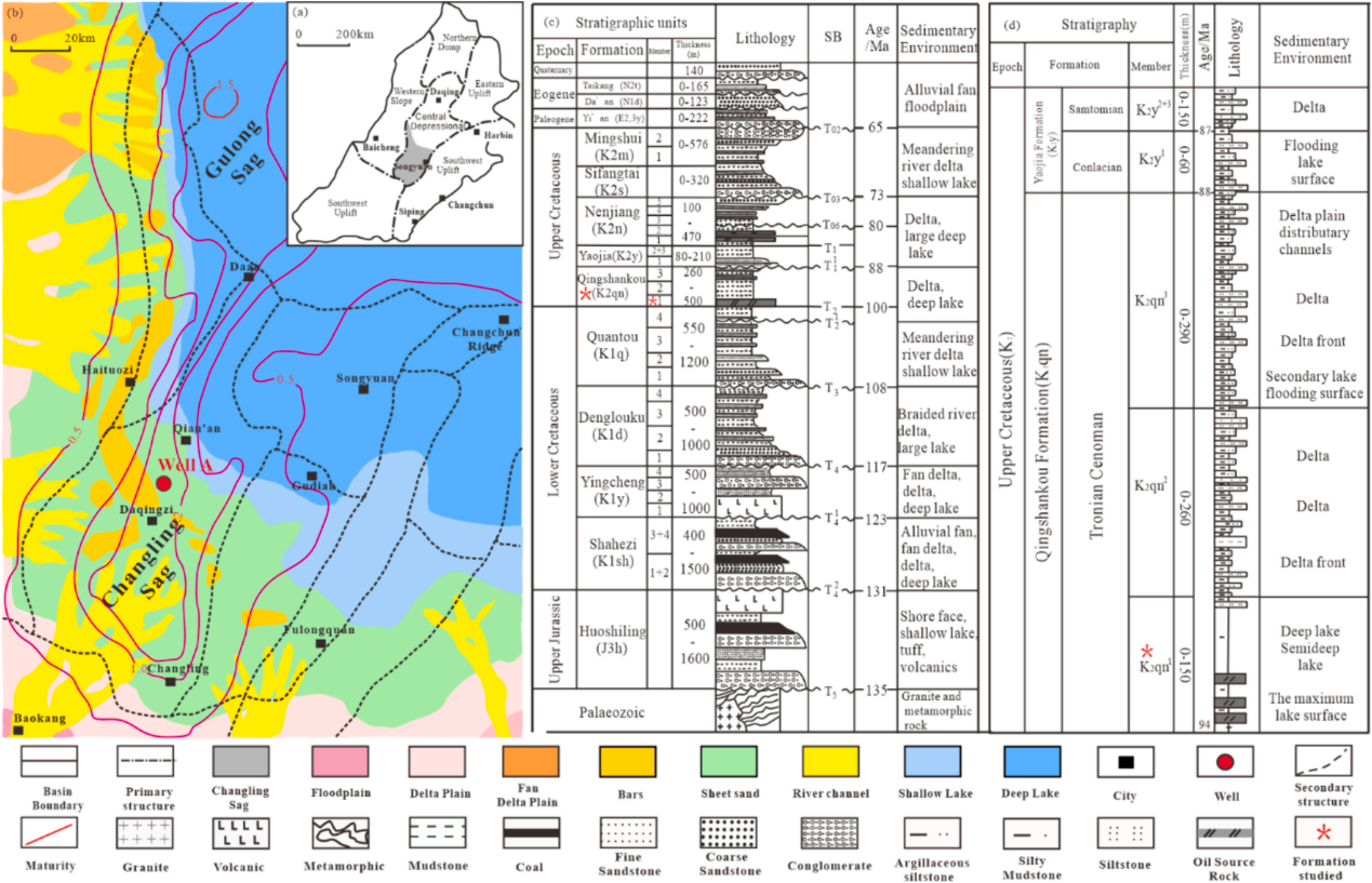 图1.松辽盆地长岭凹陷青山口组构造位置及综合地层图