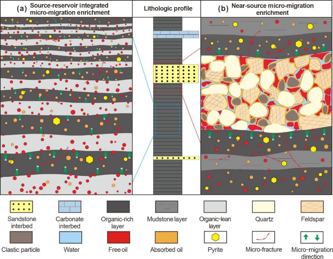 近年来,大量勘探实践表明,页岩油的富集不仅与原地滞留效应有关,还与烃类的微运移密切相关。微运移反映了石油从生成、排出到富集全过程,影响了页岩内部多层系含油、多类型局部富集特征。研究页岩油微运移机制对深化页岩油差异富集机理,推动页岩“甜点”预测具有重要意义。