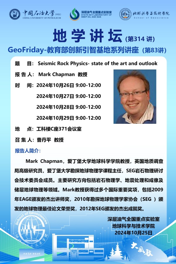 【地学讲坛第314讲】关于Mark Chapman 教授《Seismic Rock Physics- state of the art and outlook》学术报告的通知