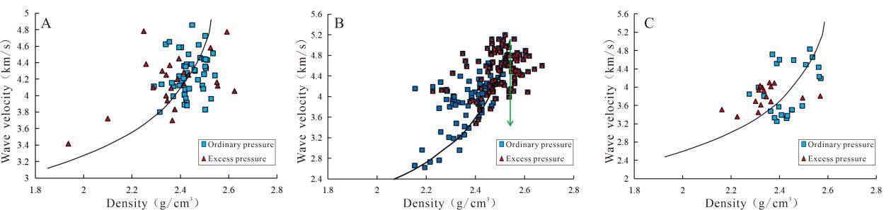图2. 胜北洼陷三工河组样品声波速度与密度关系图