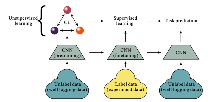 本研究提出了一种对比学习-卷积神经网络(CL-CNN)框架,旨在提升页岩油储层孔隙度评估的精度。该框架分为预训练和微调两个阶段: