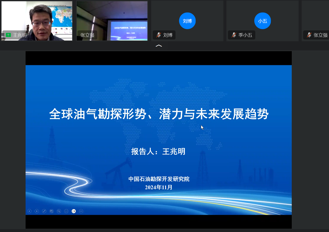 2024年11月15日下午,教育部“油气田开发地质课程”虚拟教研室、全国高校“双带头人”教师党支部书记工作室、山东省示范性基层教学组织、地学院在工科C楼757会议室举办全球油气勘探形势专题讲座。本次讲座特邀中国石油勘探开发研究院油气资源战略选区企业高级技术专家王兆明博士,作题为“全球油气勘探形势、潜力与未来发展趋势”的学术报告,来自yL23411永利集团、中国矿业大学、山东科技大学等高校教师、资源勘查工程专业本科生以及研究生共130余人参加了线上、线下会议,虚拟教研室负责人张立强教授主持会议。