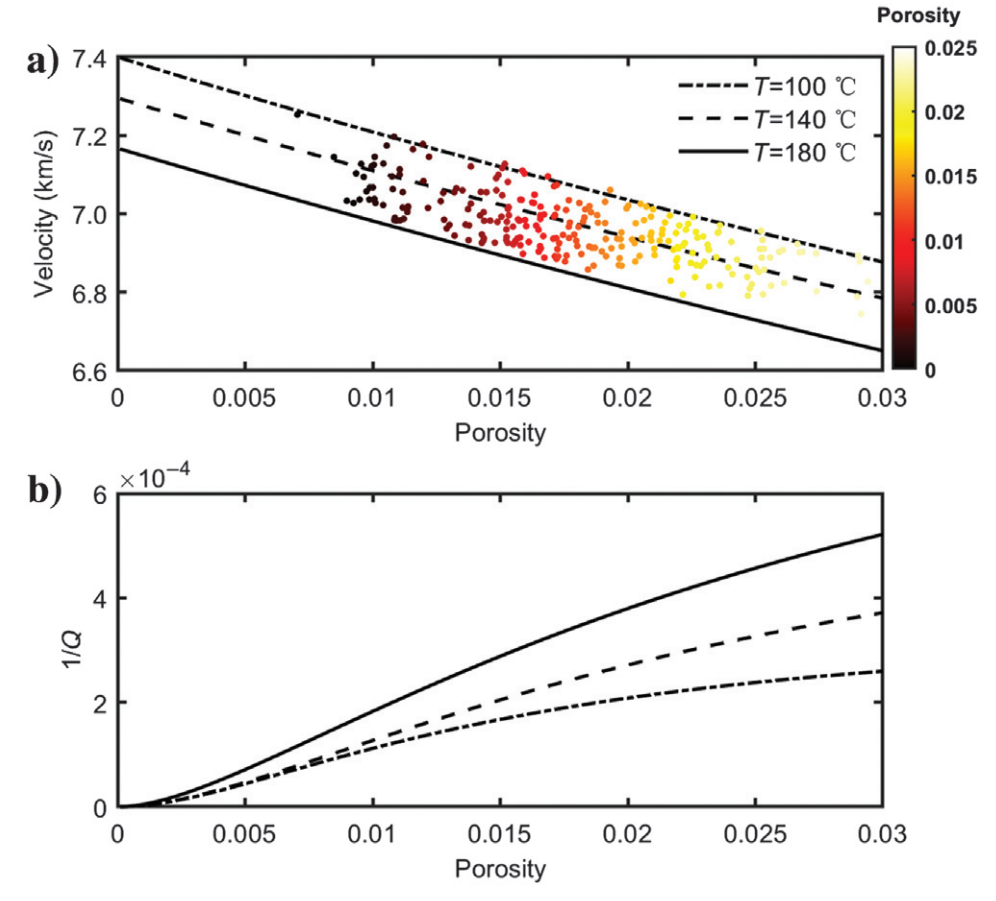 图2.(a) 不同温度下预测的P波速度与测井P波速度随孔隙度变化的比较,(b) 在声波频率下得到的衰减因子