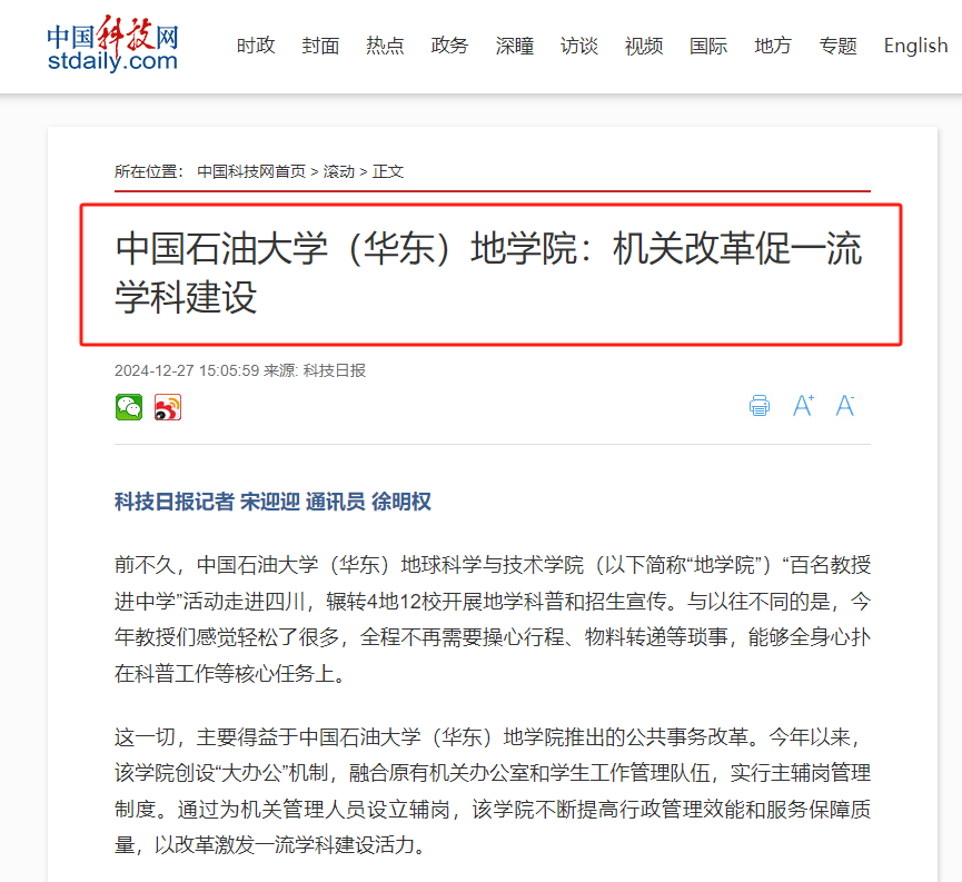 12月27日,科技日报·中国科技网以《yL23411永利集团地学院:机关改革促一流学科建设》为题,报道学院公共事务改革典型经验,获得广泛关注。