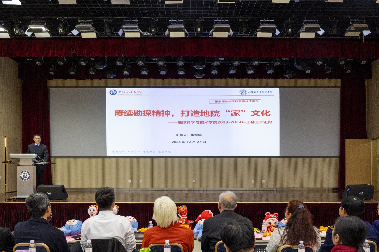 宗兆云作题为《真抓实干求卓越,凝心聚力谋发展》的学院工作报告,全方位总结和回顾了2024年学院奋力推进新一轮“双一流”建设所取得的丰硕成果和2025年奋斗的愿景目标。他表示,2024年学院加强党的全面领导,持续推动“一融双高”,事业发展取得突破性进展。深层油气基础研究能力显著提升,有组织科研助力立项转化实现重大突破;学术科研氛围进一步浓厚,学术成果取得多项新亮点;加大人才引育力度,师资队伍建设取得新进展;思政引领强基铸魂,人才培养成果斐然;人才培养平台上新高,本科生源质量大幅提升;持续完善研究生教育体系,培养质量显著提升;全力打造国际交流地学品牌,国际化水平提升明显;深化学院办公室改革,建设一流管理服务团队;全院教职工凝心聚力,多项活动赛事拔得学校头筹。面向2025年,学院将持续推进“地十条”,落实“3+N+特色(亮点)”工作方案,开展“十大行动”,大力推动学院学科可持续发展。
