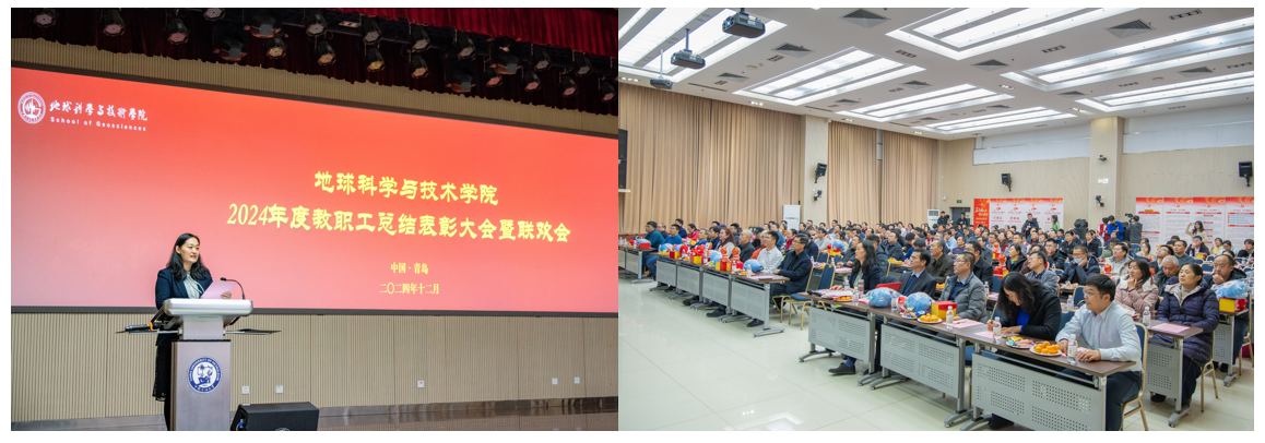 教职工联欢会由学院工会主席张军华主持。开始前,学院为“健步行”活动中表现突出的老师颁奖。随后,院属各单位分别表演节目,首先上台的是院机关全体职工,带来的节目《RED》活力四射,活跃了现场的气氛;资源系带来的节目《盘点这一年的收成》,用独具特色的方言,在轻松的氛围中回顾过去一年的进步与收获;地质系的节目《三句半》构思巧妙,在场老师掌声连连,将现场欢乐的气氛带至高潮;测井系的节目《爱如火》形式新颖奇特,传达出教职工昂扬向上的精神风貌;地物系由教师和学生共同带来歌曲联唱,特别是用录制《送你一朵小红花》表达对老师们的礼赞;最后,新入职教职工进行自我介绍并为全院教职工送上最诚挚的新年祝福。