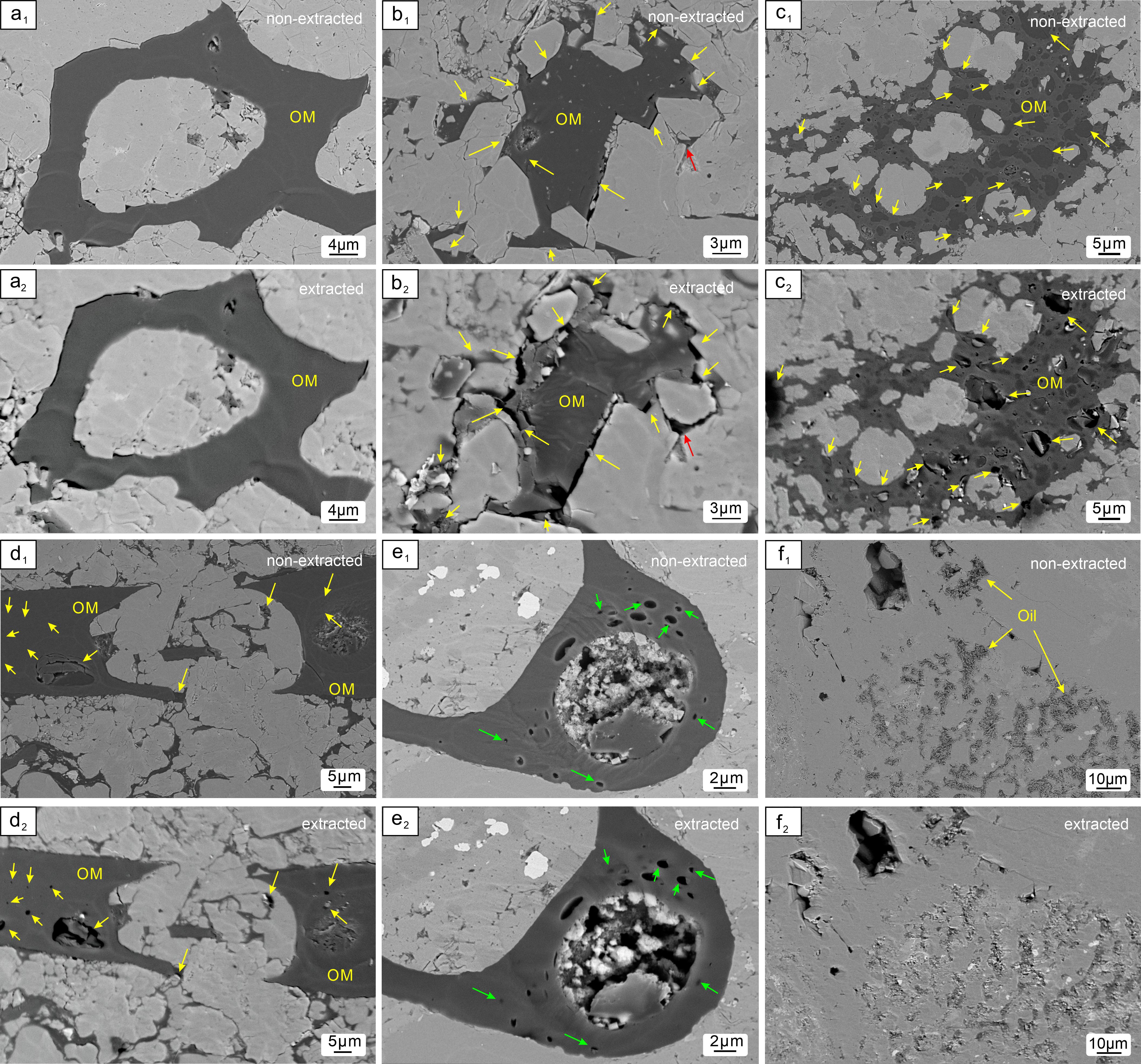 (a1-a2)溶蚀抽提前后有机质无显著变化;(b1-b2)溶剂抽提后,无机矿物和有机质接触面出现大孔(黄色箭头),无机孔隙中赋存的油被完全去除(红色箭头);(c1-c2)有机质内部的可溶有有机质被去除,产生了纳米至微米级的有机质孔;(d1-d2)溶剂抽提后,产生纳米级有机质孔;(e1-e2)有机质膨胀导致部分有机质孔减小(绿色箭头);(f1-f2)溶剂抽提后,粒间孔中的残余页岩油被去除。