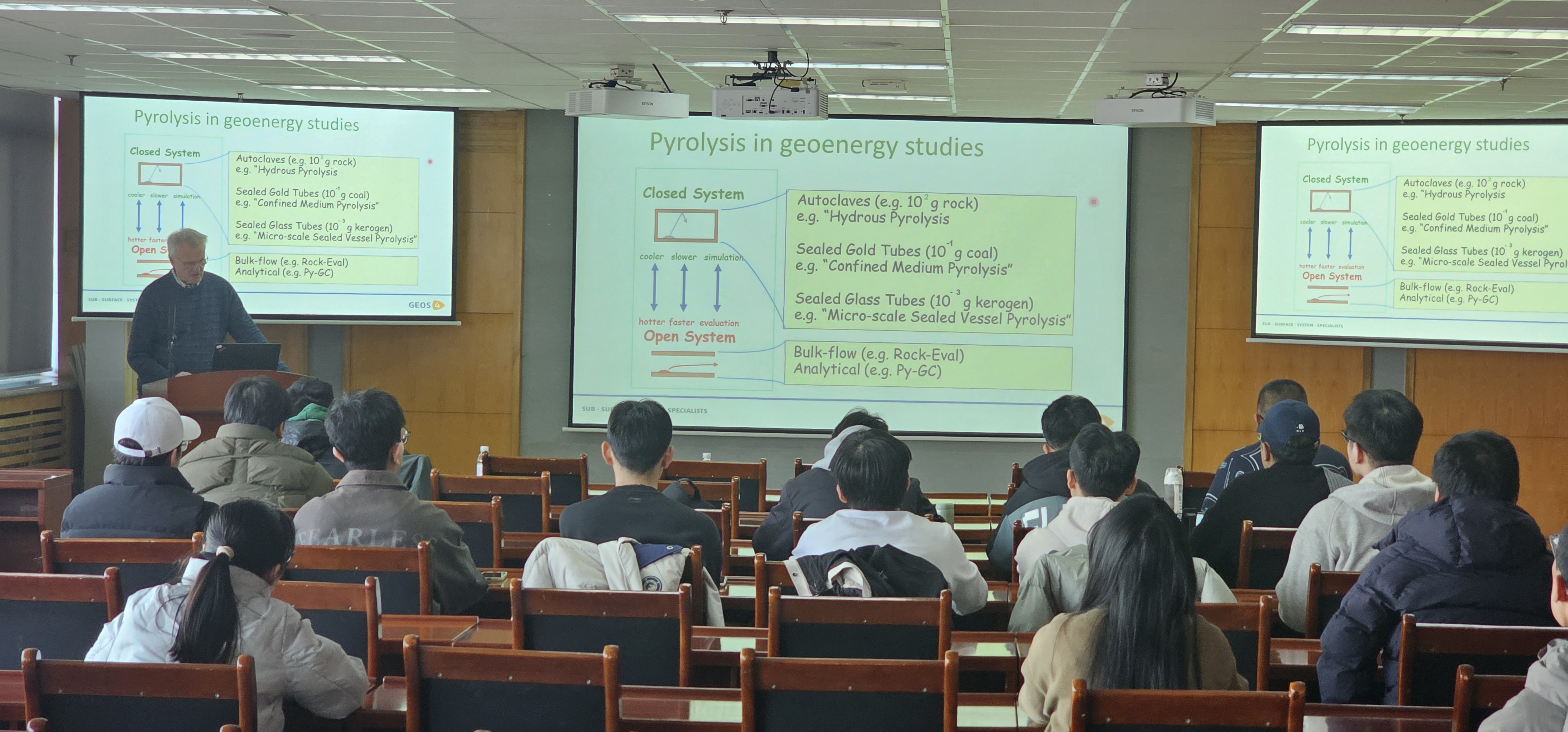 热解技术通过高温加热有机质,使其在无氧环境下发生化学分解,是模拟石油生成、评估油气生成潜力及预测生成石油类型的重要技术手段。Horsfield院士在报告中深入浅出地讲解了热解技术在能源地质研究中的关键作用,尤其是在量化油气生成量、预测生成石油类型及预测源内外油气气油比等方面开展了详细汇报。最后,Horsfield院士还扩展了热解技术在天然氢气勘探中的潜在应用,进一步开拓了与会者的研究视野,并为未来相关领域的研究指明了方向。报告结束后,Horsfield院士与在场的师生进行了深入的学术交流,针对“快速热模拟实验与慢速地质热模拟结果的匹配”以及“开放与密闭体系热解氢气产量差异”等问题展开了热烈的讨论。