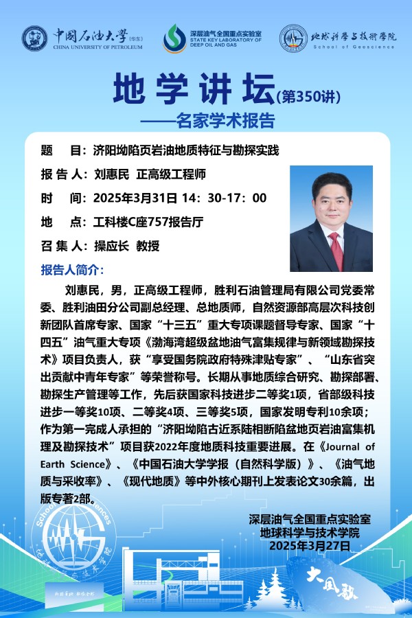 【地学讲坛第350讲】关于刘惠民 正高级工程师《济阳坳陷页岩油地质特征与勘探实践》学术报告的通知