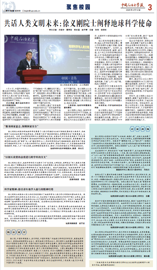 4月12日出版的《中国石油大学报》第3版,整版聚焦地球科学,围绕徐义刚院士《地球科学与人类文明》学术报告,访谈我院7名师生,畅谈服务国家能源战略、开展跨学科交叉、青年地学人才发展等方面的感悟和规划。