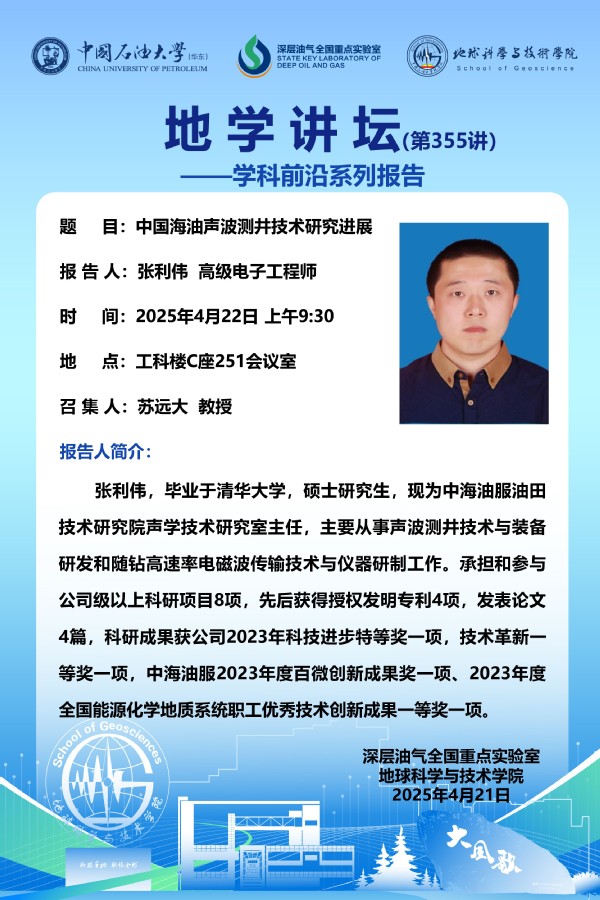 【地学讲坛第355讲】关于张利伟高级电子工程师《中国海油声波测井技术研究进展》学术报告的通知