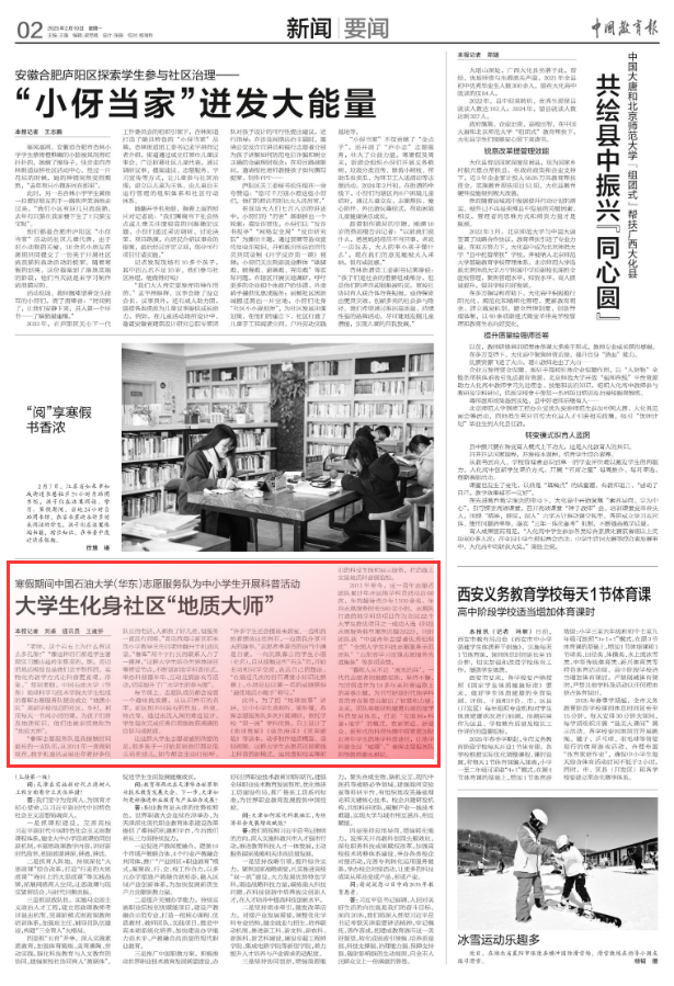青春建功——精准锚定服务大局新坐标,青年服务大局建新功。900余名春晖志愿者累计服务时长超11000小时,累计募捐图书超7000册,春晖事迹获山东电视台等报道7次,“地质小队”深入社区科普获《中国教育报》纸媒报道,成为展示石大形象的闪亮名片。