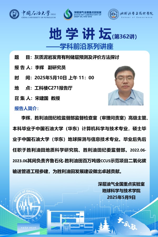 【地学讲坛第362讲】关于李辉 副研究员《灰质泥岩发育有利储层预测及评价方法探讨》学术报告的通知