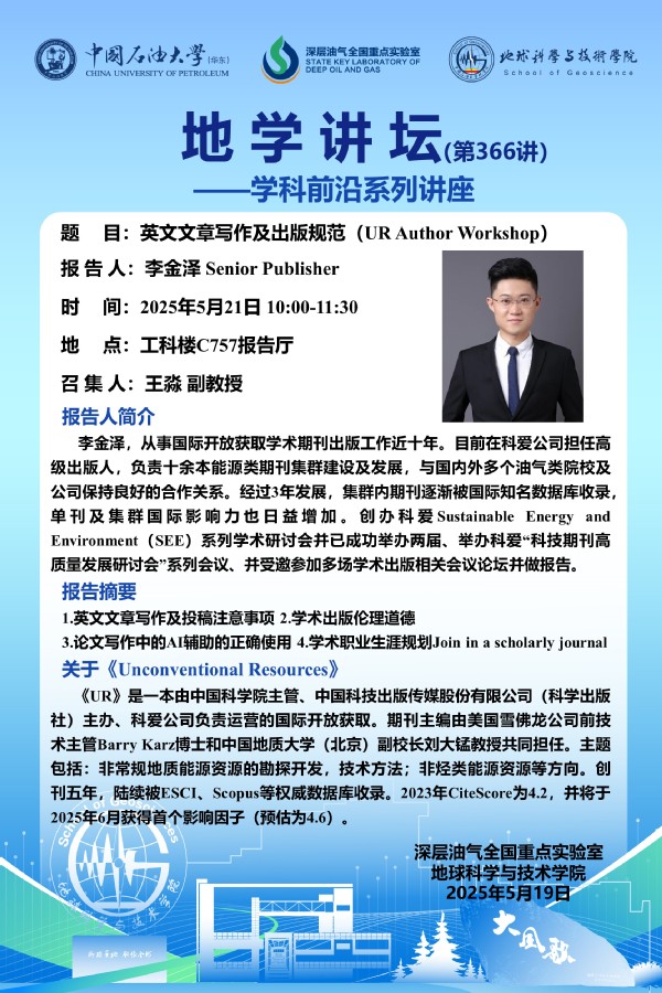 【地学讲坛第366讲】关于李金泽《英文文章写作及出版规范(UR Author Workshop)》学术报告的通知