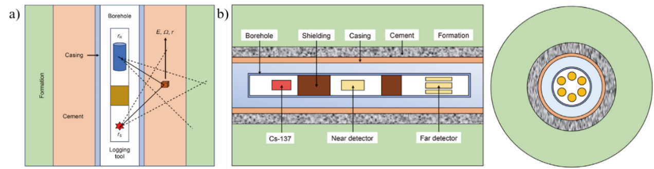 图1 固井质量测量原理示意图 a) 多重介质伽马射线传播示意图 b)多探测器方位密度仪器固井质量测量示意图