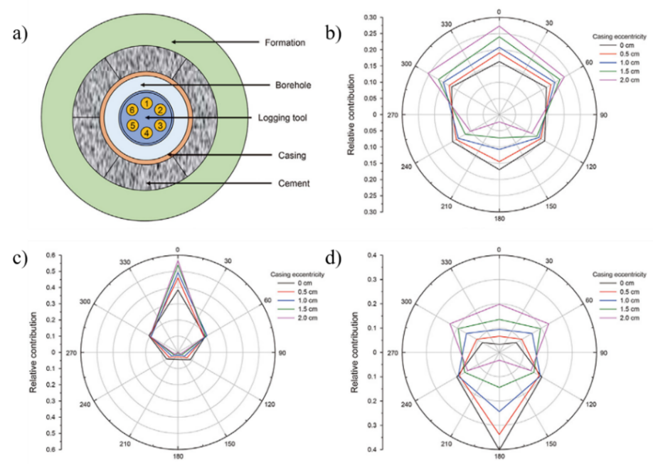 图2 套管偏心情况下不同水泥扇区基于空间动态响应函数的贡献情况 a)水泥的扇区分布示意图b)不同扇区对近探测器贡献情况c) 不同扇区对1号远探测器贡献情况d)不同扇区对4号远探测器贡献情况
