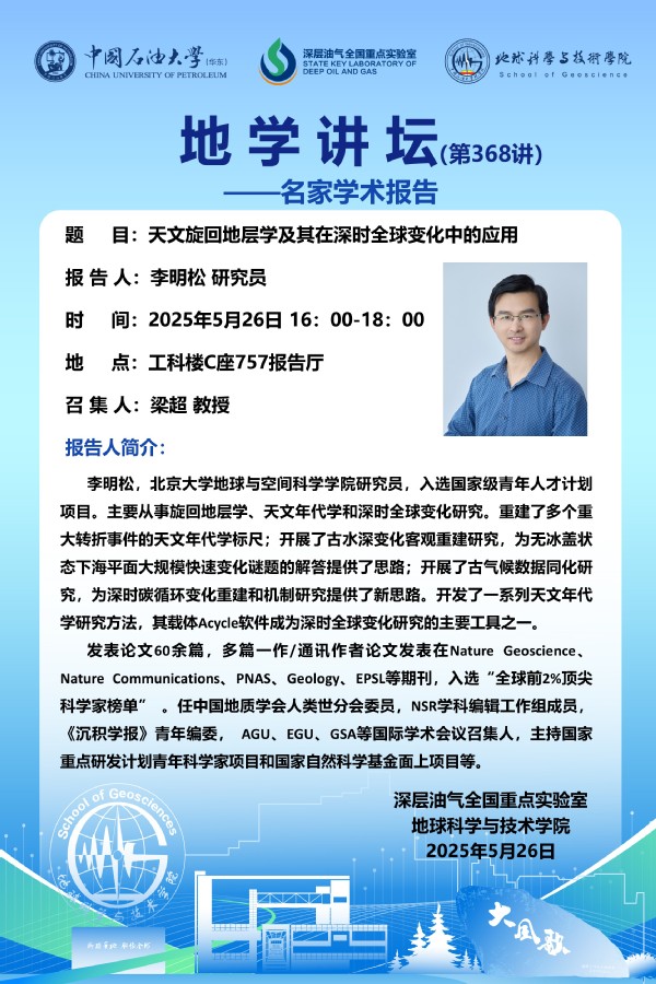 【地学讲坛第368讲】关于 李明松 研究员 《天文旋回地层学及其在深时全球变化中的应用》学术报告的通知