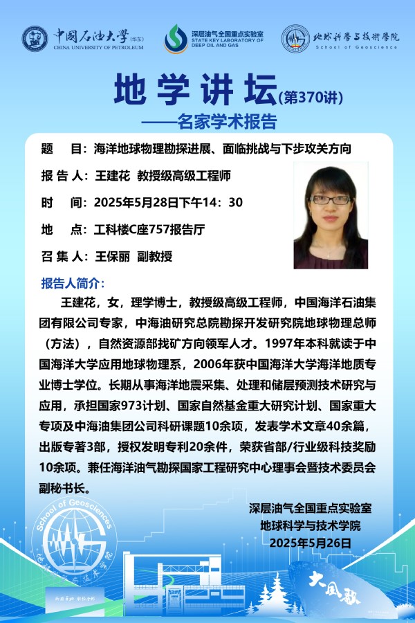 【地学讲坛第370讲】关于 王建花 教授级高级工程师 《海洋地球物理勘探进展、面临挑战与下步攻关方向》学术报告的通知