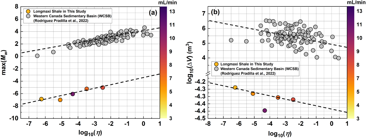 本研究创新性地构建了水力压裂能量平衡方程:通过高精度传感器校准和AE能量智能优化反演算法,实现了对地震效率的精确表征(),研究发现:log(η)与最大震级呈正相关关系,与log(∆V)(注入体积)呈负相关关系,且均具有一定的注入速率依赖性。该规律与现场数据对比具有一致性(图1)。