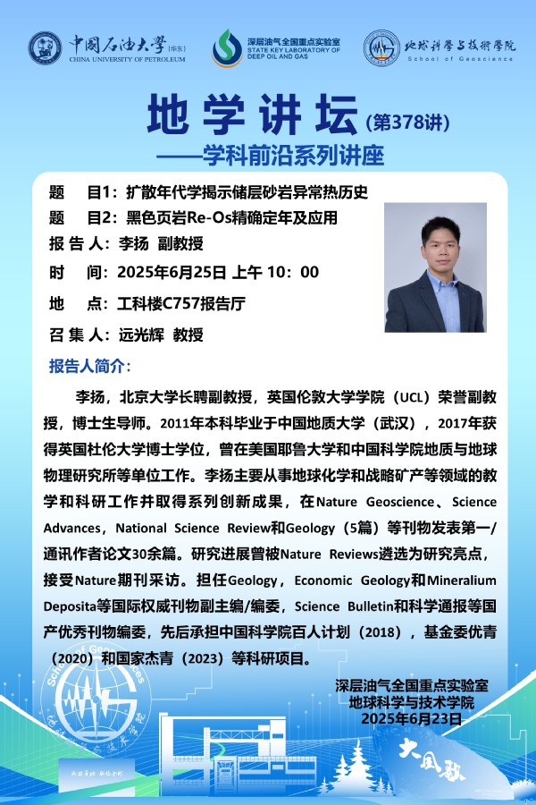 【地学讲坛第378讲】关于 李扬 副教授《扩散年代学揭示储层砂岩异常热历史》和《黑色页岩Re-Os精确定年及应用》学术报告的通知