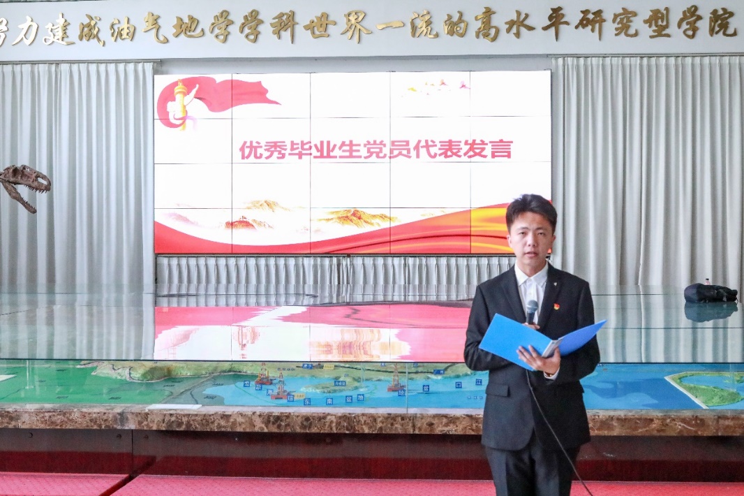毕业生党员代表刘岩鑫担任班级班长、党支部委员,他刻苦学习、积极奉献,获中国石油奖学金、全国大学生地质技能竞赛特等奖、优秀学生干部等奖励,已保送至南京大学继续攻读研究生。发言中他希望同志们牢记勘探尖兵的使命担当,永远向地层深处探寻,像石油般燃烧炽热能量,将信仰深深扎根于“为人民服务”的厚土之中,在祖国最需要的地方,勇于担当、积极作为,绽放属于青年党员的光芒。