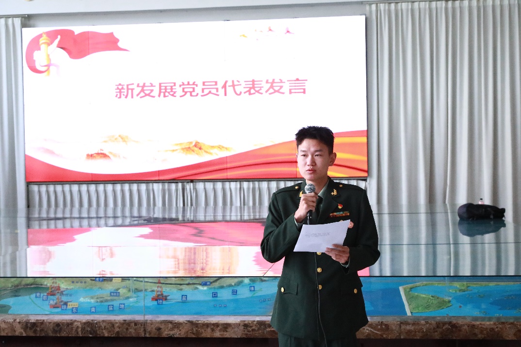 新发展党员代表孙浩楠是一名褪下军装、重返校园的退役大学生,在部队发扬不怕苦、不怕死的精神,被选拔执行国家级重大任务,圆满完成任务。回到学校后坚持“退伍不褪色”,努力学习、团结同学,志愿服务冲在“最前线”,他表示,要继承和发扬伟大的建党精神,坚守入党初心,以“党员”的担当、“地学人”的坚韧,服务人民,奉献社会,勇攀高峰。