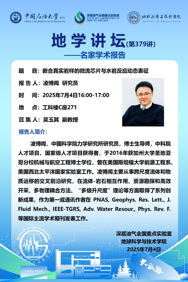 【地学讲坛第379讲】关于凌博闻 研究员《嵌合真实岩样的微流芯片与水岩反应动态表征》 学术报告的通知