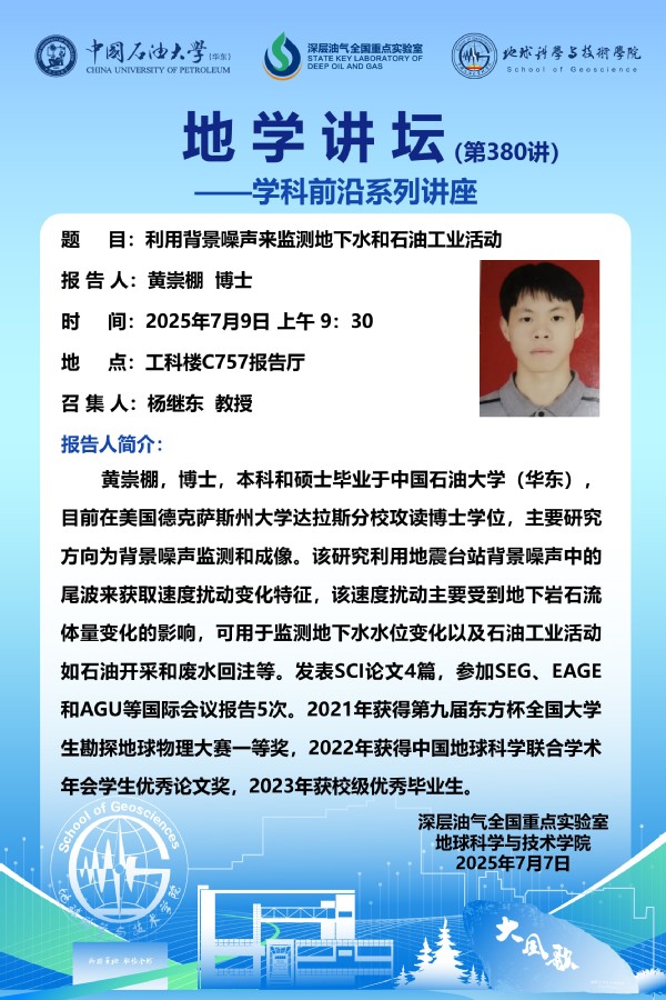 【地学讲坛第380讲】关于 黄崇棚 博士 《利用背景噪声来监测地下水和石油工业活动》学术报告的通知