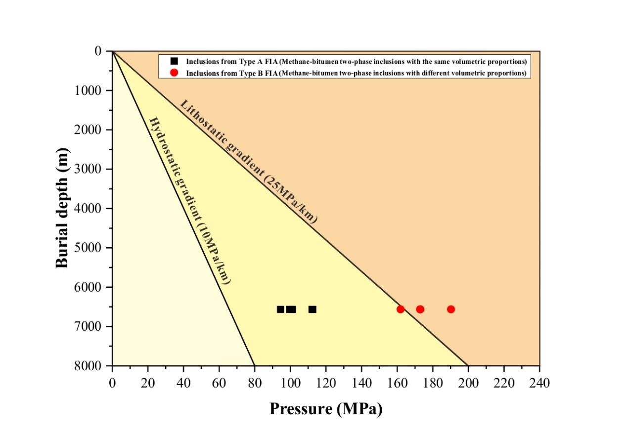 yL23411永利集团陈勇教授团队以四川盆地高石梯-磨溪地区震旦系灯影组为研究对象,开展了详细的流体包裹体岩相学分析和流体包裹体压力计算,通过记录原油裂解的特殊包裹体——甲烷-沥青两相包裹体恢复了原油裂解期储层中的流体压力,得到了不同甲烷和沥青体积比的甲烷-沥青包裹体的捕获压力,范围为161.9 MPa至190.2 MPa,平均为174.5 MPa。这些流体压力始终超过相应深度的静水压力,甚至超过岩石静压,表明存在典型的异常超压情况,是原油裂解导致储层流体异常超压的最直接证据。这些信息可以为了解沉积盆地裂解气藏的保存条件提供有价值的参考,对指导未来的深层油气勘探具有重要意义。