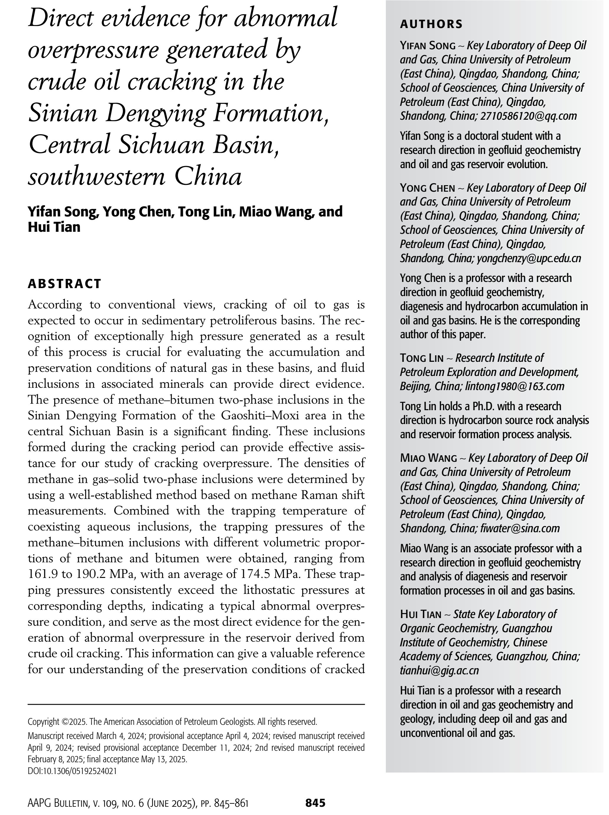 论文信息:Song, Y.F., Chen, Y., Lin, T., Wang, M., Tian, H., 2025. Direct evidence for abnormal overpressure generated by crude oil cracking in the Sinian Dengying Formation, Central Sichuan Basin, southwestern China. AAPG Bulletin, 109 (6): 845–861. doi: https://doi.org/10.1306/05192524021