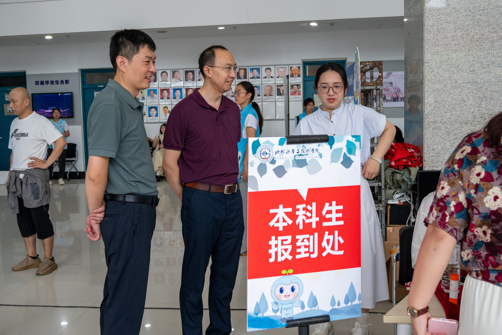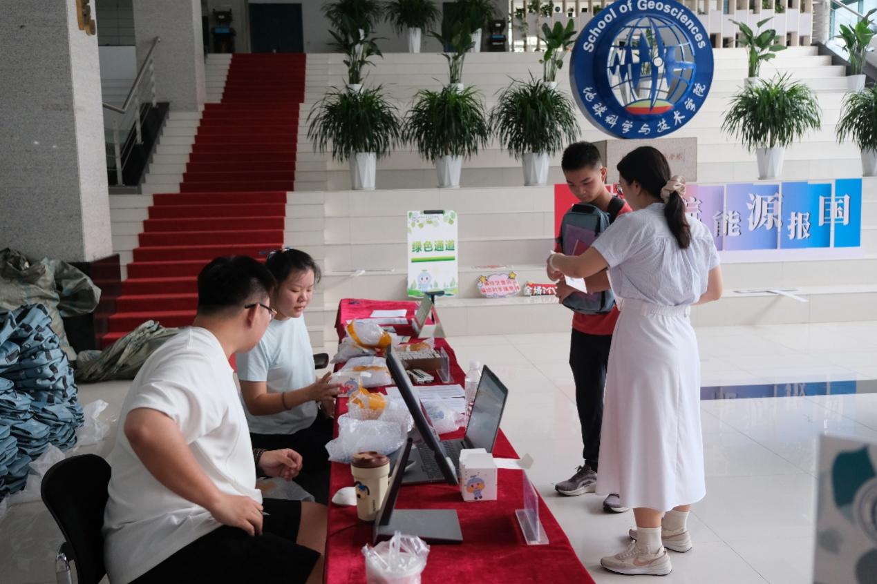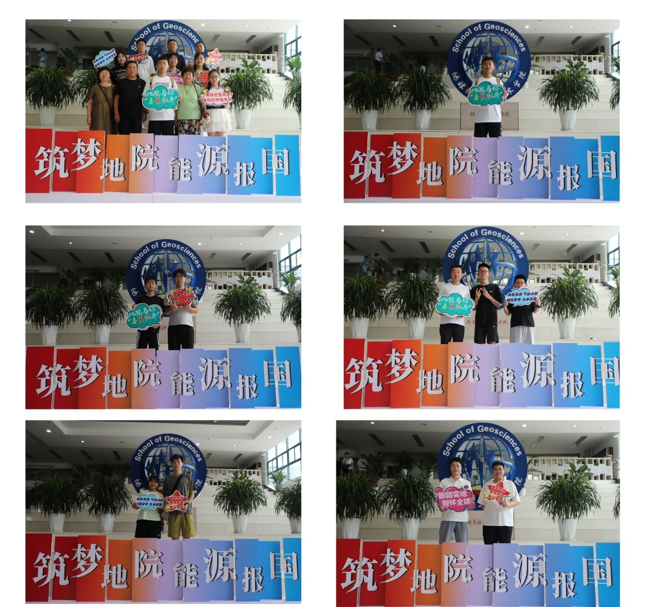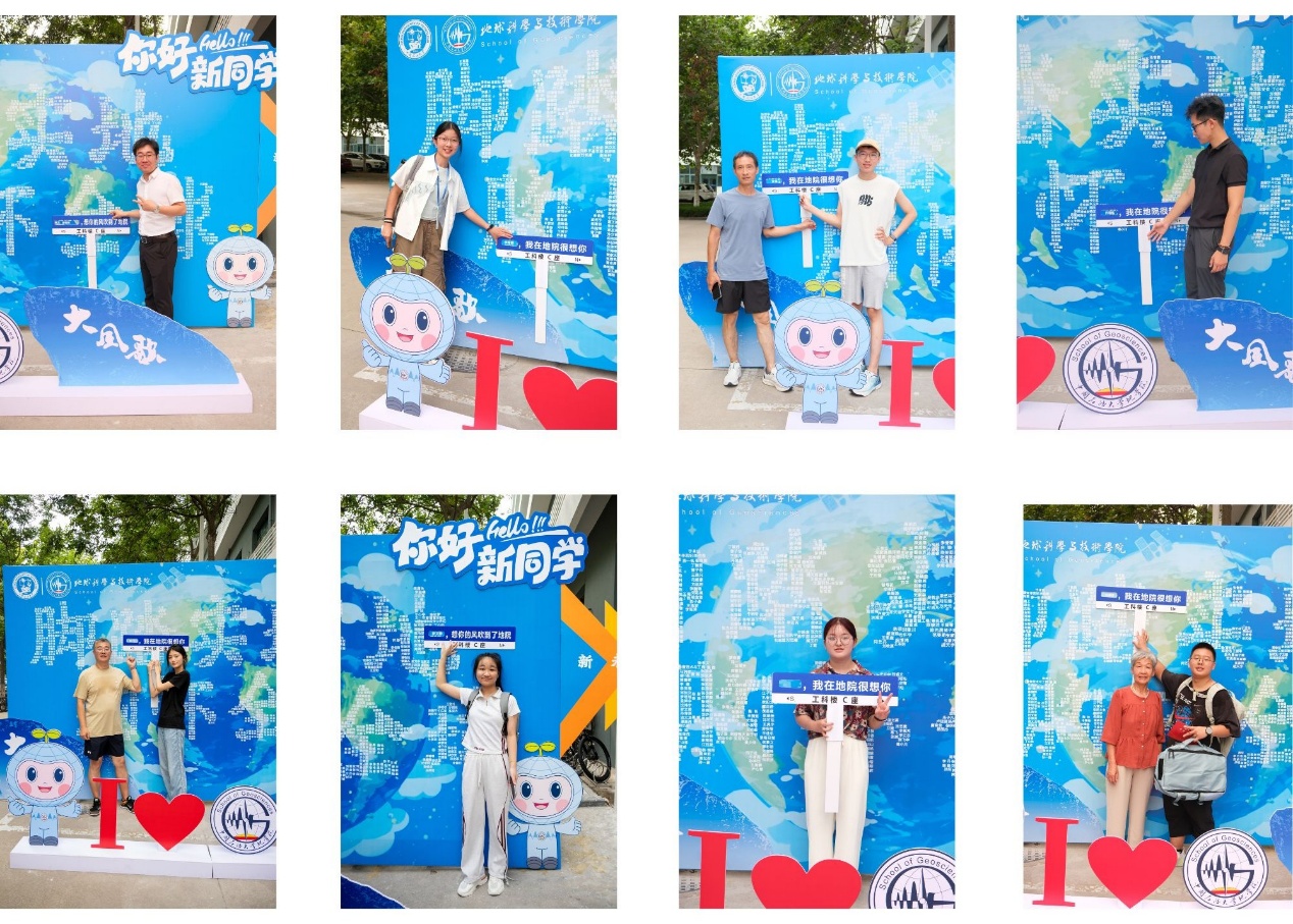 除了高效的报到流程外,迎新现场还处处彰显学院的人文关怀。新生和家长进入报到大厅后,可以挑选喜欢的打气牌,在院徽标志前合影留念;学院在院外打造了特色互动场景 —— 以院训“脚踏实地,胸怀全球”为背景的欢迎墙,院训由所有新生名字组合而成,既彰显学院精神,也为新生营造了归属感与仪式感,不少新生与家长在此驻足拍照打卡,并有地院传媒志愿者专人负责记录这进入大学校园的珍贵瞬间。此外,学院为新生准备了“寻宝图”,新生答对图中问题即可获得宝藏盲盒,收获满满的惊喜。