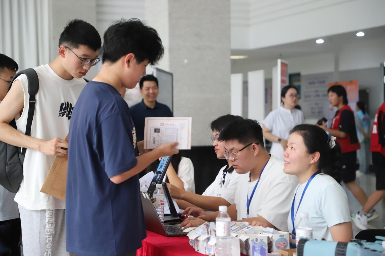 迎新首日午后,院长宗兆云、党委书记牛庆玮、党委副书记穆洋洋和部分班主任前往迎新现场视察,深入各服务区域查看新生报到进度,听取各点位工作汇报。期间,学院党委副书记穆洋洋和辅导员亲切交流,询问工作中遇到的问题,并对全体迎新人员的辛苦付出表示肯定与赞许;同时主动与新生及家长沟通,了解新生感受与实际需求,叮嘱新生尽快适应校园环境,做好大学规划。考虑到天气炎热,学院准备西瓜,由志愿者分发给等候的家长,清甜的口感驱散了舟车劳顿的暑气,让家长们感受到学院细致的关怀。