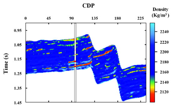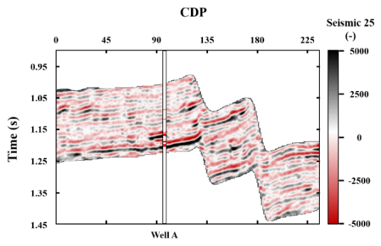 在实际工区数据测试中,我们从中国东部的一个高孔隙度砂岩储层中选取了一个过间剖面来进行实际地震数据的反演。图2展示了在工区内以四个不同入射角度(分别为 12 度、21 度、25 度和 30 度)获取的过井A的地震剖面。该剖面中,有两个主要的高孔隙度含油砂体储层,它们在解释中的红色位置与井 A 相交。