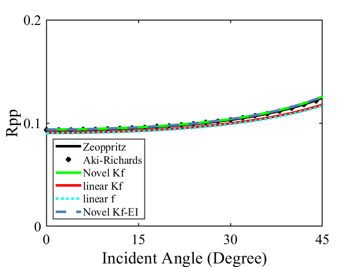 所推导的非线性反射系数方程的创新之处在于将孔隙流体的体积弹性模量纳入反射系数中,从而将地下介质的假设范围扩大到包括被流体充满的多孔介质,能够更准确地反映砂岩储层的地震反射特征(图1)。