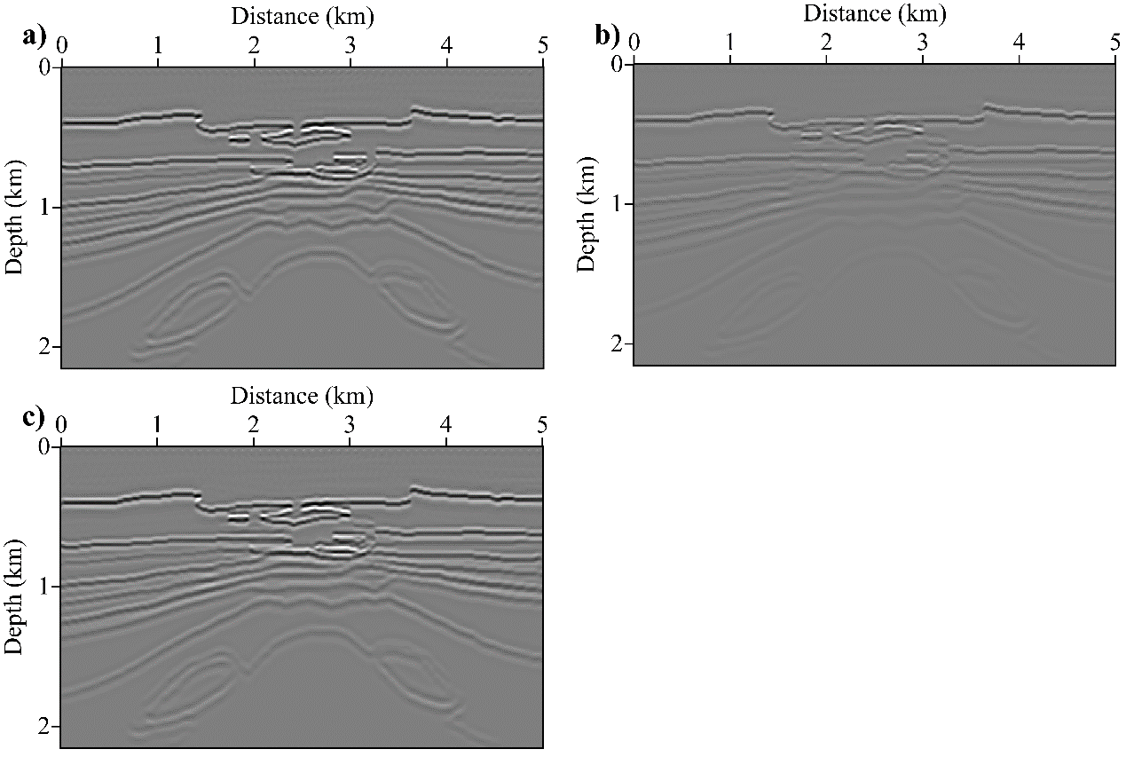 图2. 逆时偏移成像结果:(a)声波逆时偏移(参考结果);(b)未补偿声波逆时偏移;(c)补偿的声波逆时偏移