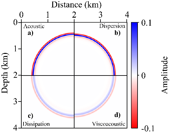 图1. 粘声波场解耦结果对比:(a)声波;(b)频散主导的粘声波方程;(c)振幅衰减主导的粘声波方程;(c)粘声波方程