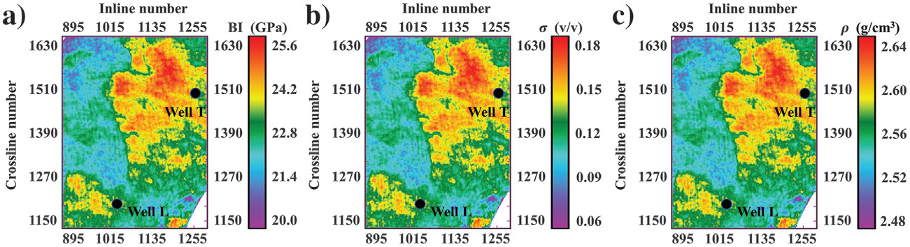 图2 反演结果切片(a)脆性指数切片结果;(b)泊松比切片结果;(c)密度切片结果