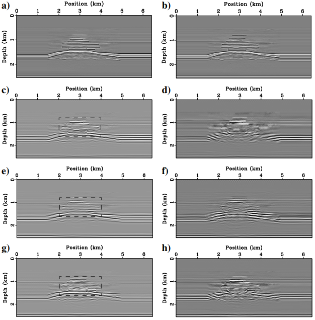 图2. Valhal模型成像结果对比,左列为P-P反射率及成像结果,右列为P-S反射率及成像结果,其中(a)和(b)为真实反射率,(c)和(d)为传统逆时偏移,(e)和(f)为常规数据域最小二乘偏移,(g)和(h)为多参数PSF反褶积结果