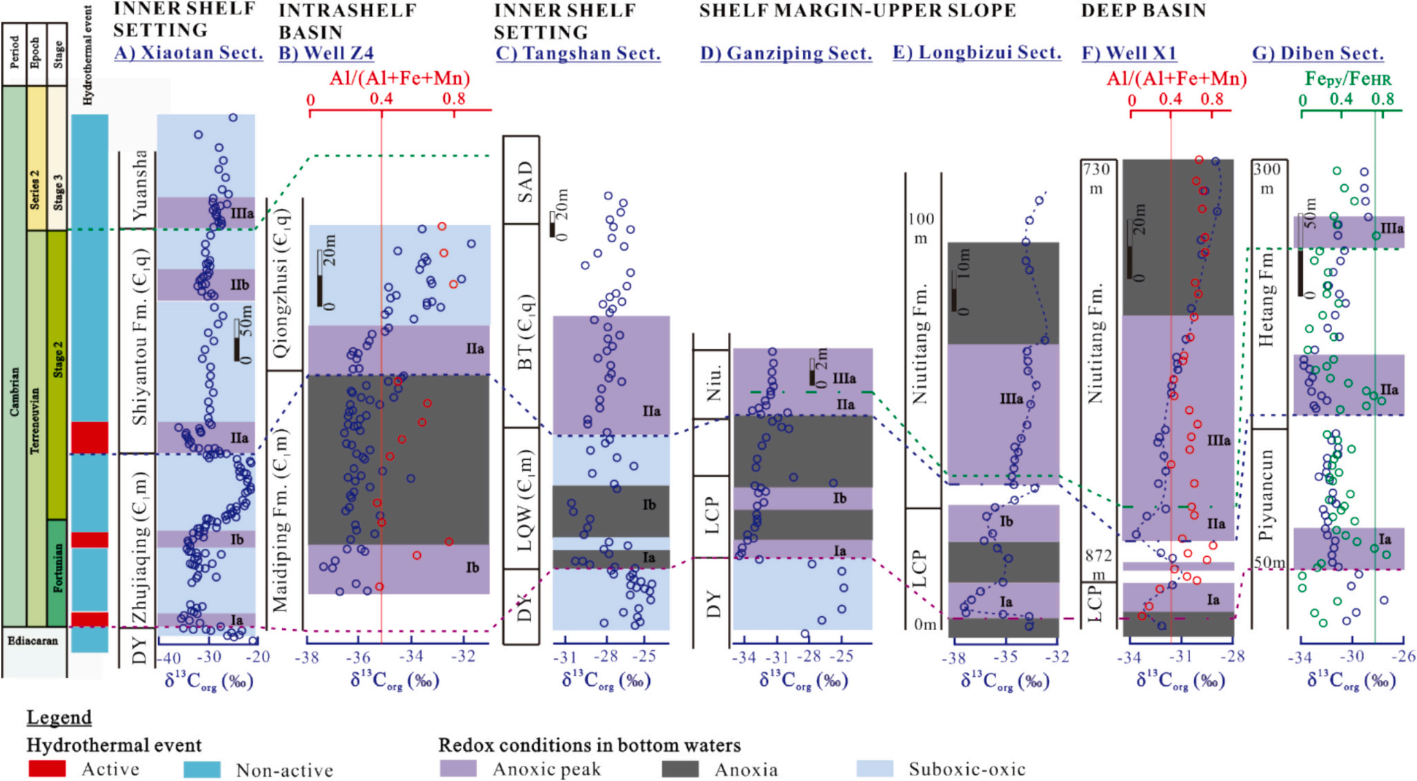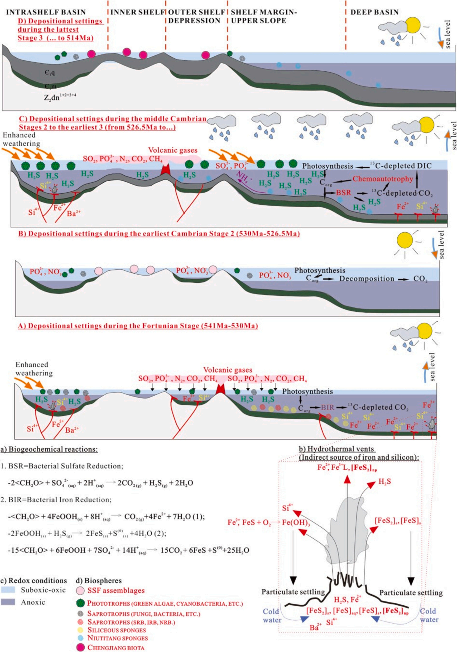 本研究采集青川-资阳-宜宾地区的钻孔岩芯样品,系统分析了硫酸盐矿物的δ34S值、碳酸盐矿物的δ13C值,以及岩石整体的元素含量(包括总有机碳、总硫、主量及微量元素)(图1)。通过与前人报道的地球化学数据对比,研究发现:(1)早寒武世存在五个广泛分布的海洋缺氧期,且这些缺氧期与初级生产活动的强弱变化吻合;(2)陆源物质输入促进了富32S硫酸盐的形成,进而驱动后续生物化学分异过程,导致黄铁矿δ34S呈现复杂的形成途径;(3)陆源营养物质对维持海洋初级生产具有关键作用。