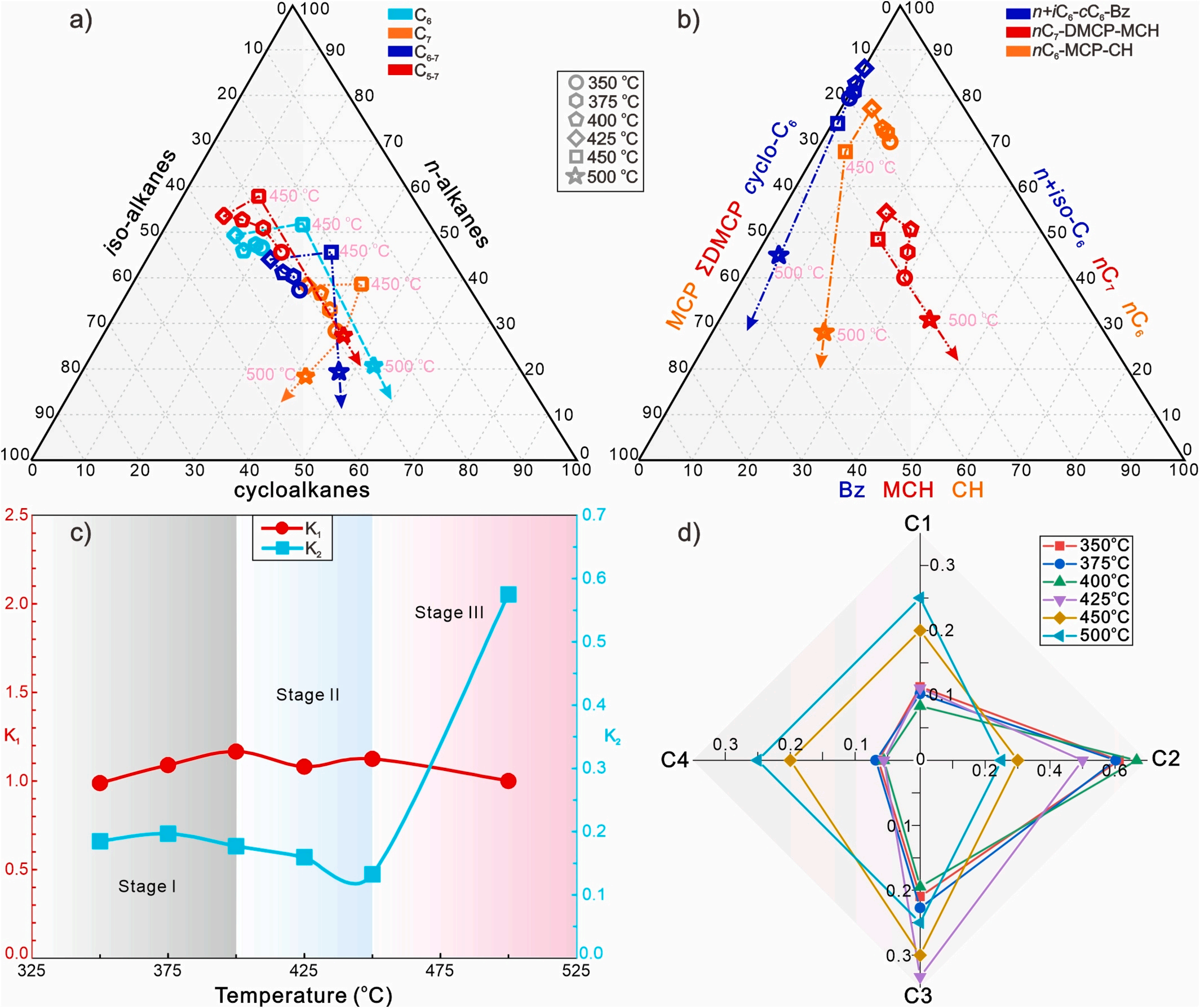 图2 热裂解过程中轻烃类有机质类型判识和成因对比指标的演化特征