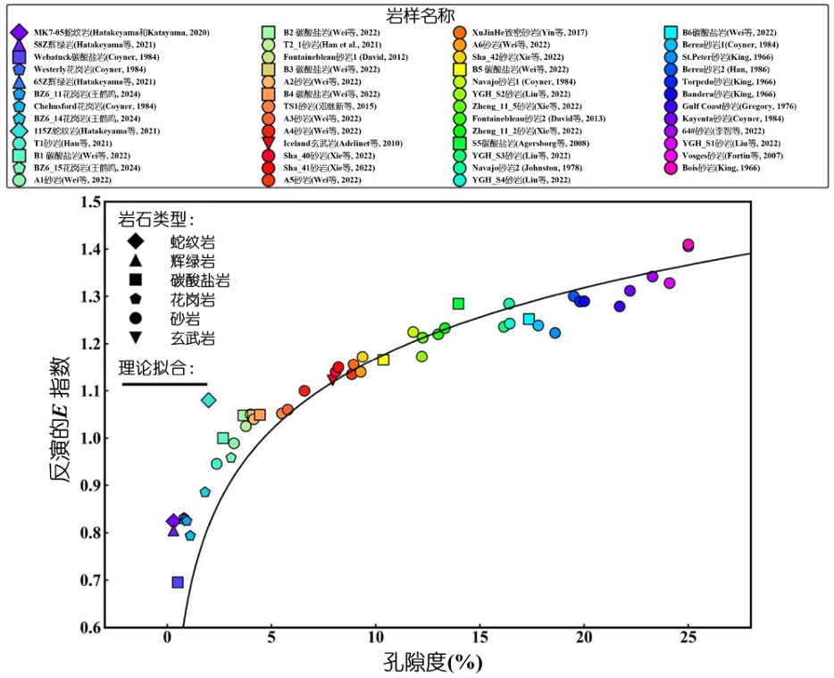 将储层岩石描述为充流体并含有大小不一裂隙的孔、裂隙介质,裂缝孔隙度与纵横比之间存在普适的幂律关系。根据裂缝长度和宽度的幂律分布,进一步推导出总孔隙度和幂指数E的理论关系。如图1,实验室52个不同岩性岩样的超声波压力-速度数据的反演幂指数E及理论拟合曲线随孔隙度单调上升验证了该理论关系的普适性,其依据是自然界普遍存在的幂律分布。