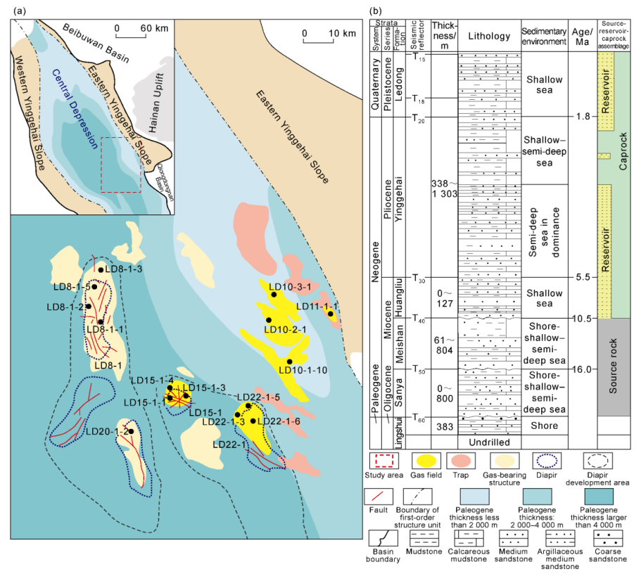 图1. 莺歌海盆地乐东底辟区构造位置与综合地层柱状图