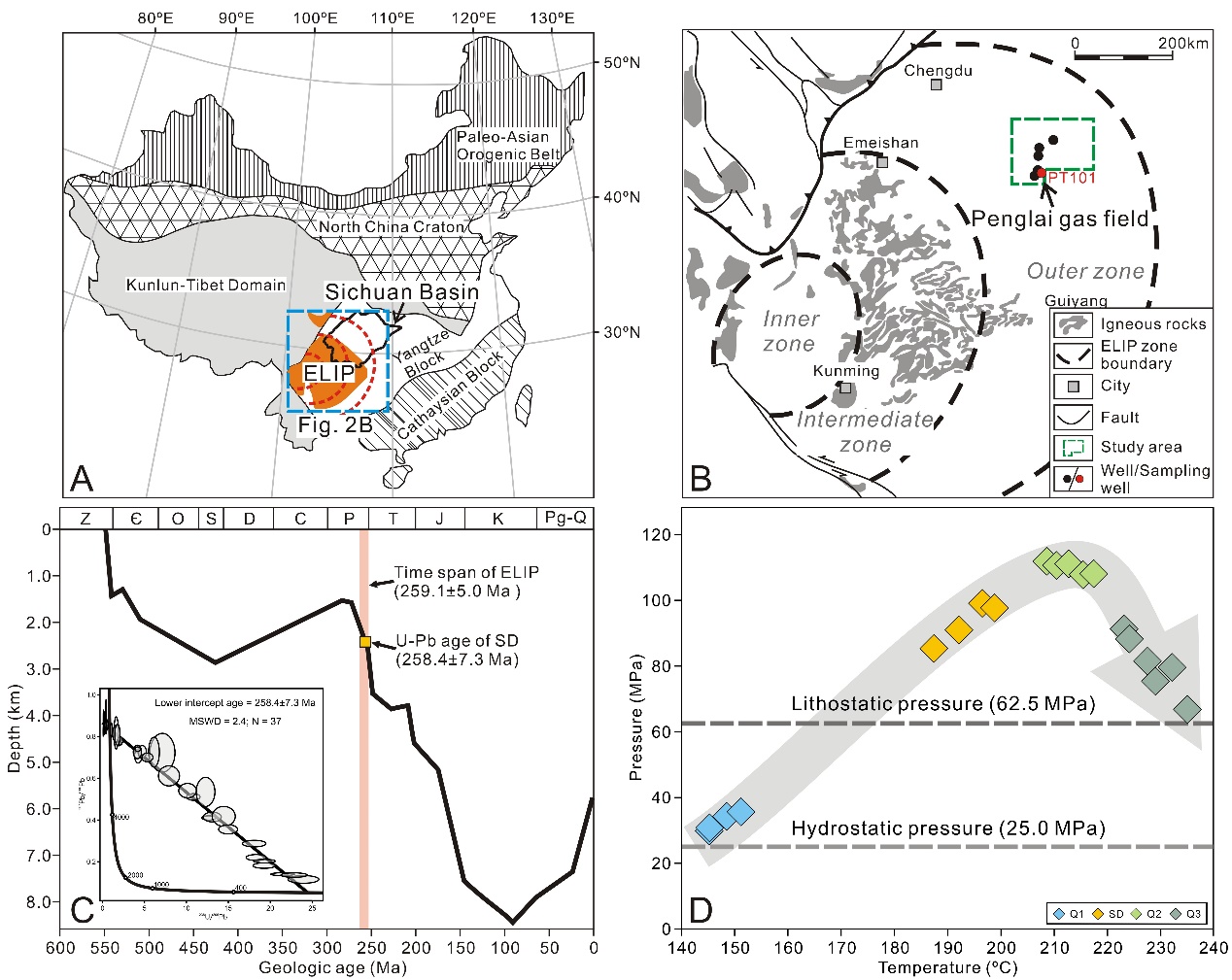 针对上述科学问题,yL23411永利集团刘可禹教授团队联合北京大学金之钧院士和中石油勘探开发研究院CNPC盆地构造与油气成藏重点实验室等单位,选取位于峨眉山大火成岩省(ELIP)外带的川中蓬莱地区埃迪卡拉纪碳酸盐岩储层作为研究对象,通过对石英和马鞍状白云石等热液矿物开展详细的岩相学、流体包裹体和微区地球化学分析,证实川中地区埃迪卡拉纪碳酸盐岩储层中古油藏的快速热解发生在距今约258.4±7.3Ma(百万年),与ELIP的爆发密切相关(图1)。热液矿物中的烃类包裹体记录了古油藏的热解过程,储层压力经历先增加后快速下降的过程,指示古油藏中形成的热成因甲烷沿断层或岩浆管道快速排放到大气中,进而对瓜德鲁普世末期大灭绝产生影响。