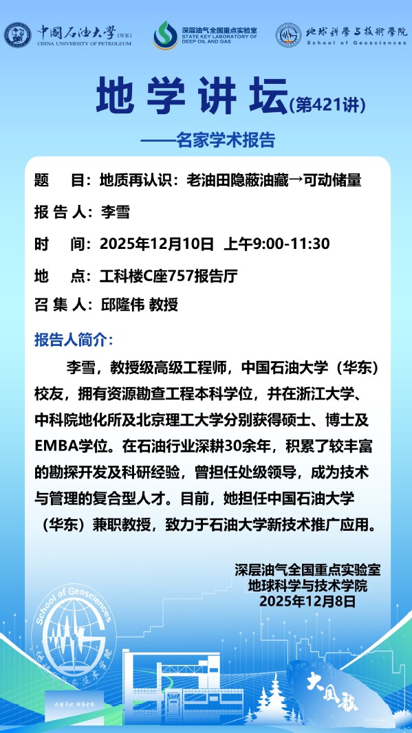 【地学讲坛第421讲】关于李雪教授级高级工程师《地质再认识:老油田隐蔽油藏→可动储量》学术报告的通知