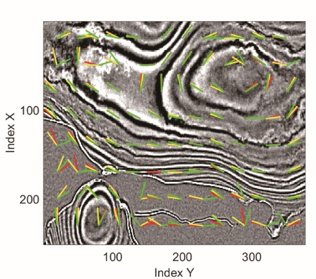 图中红色、黄色和绿色箭头分别表示采用 OLC、ST和 PWD方法得到的倾角结果