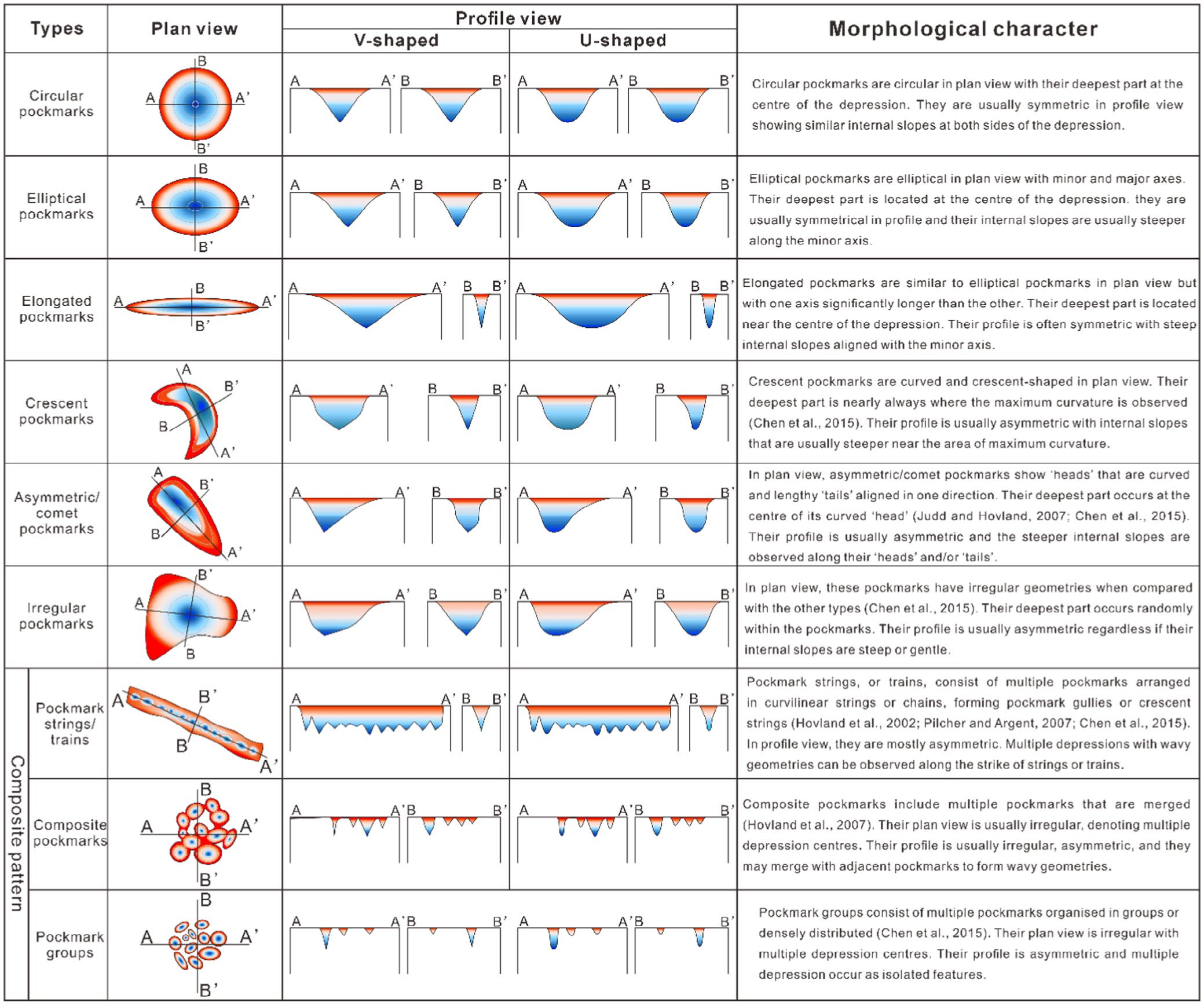 图1不同形态麻坑的平面和剖面特征