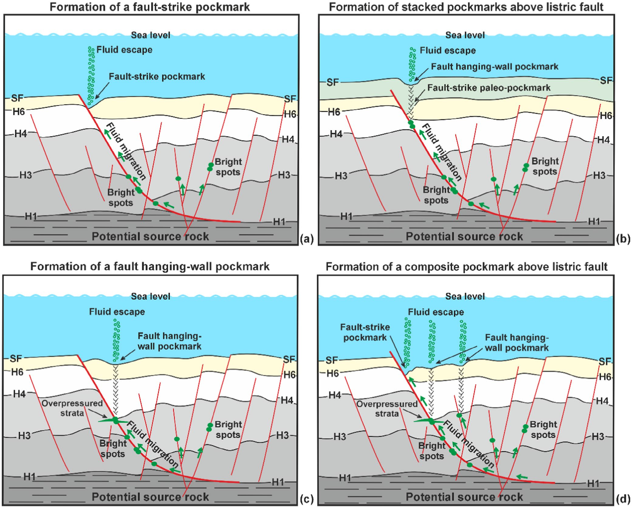 麻坑(Pockmarks)为海底凹坑,被认为是流体从海底发生逃逸的重要指示。麻坑在全球多个区域都有发现,如北海、墨西哥湾、西非、南海等,对地球生物圈、水圈和大气圈具有影响。麻坑通常在海底上表现为圆形凹坑,有时也可表现为椭圆形、新月形、不对称形或不规则形凹坑,多个麻坑能相互组合而形成不同形态的组合样式(图1)。在海底上,大型麻坑可作为相对长期的流体渗流通道,也可被后期沉积物掩埋而成为古麻坑。对于海底任意分布的麻坑,存在两种不同的机制来解释其形成过程;与之相对比,对于海底相对规则分布的麻坑,其形成往往与麻坑之下的断裂、古河道、古峡谷、底劈等有关。目前缺乏对于麻坑及其相关铲式断层的定量关系研究,限制了我们对于麻坑在海底形成过程的理解。